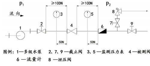 如圖所示:4位置活塞式減壓閥, 分別為ZJY46H-25C DN450活塞式減壓閥;壓力表(P1、P2)精度為0.4級,并具有穩流管和旋塞調節閥;測流流量計為電磁式或超聲波式均可,安裝于被測閥4后的規定位置。