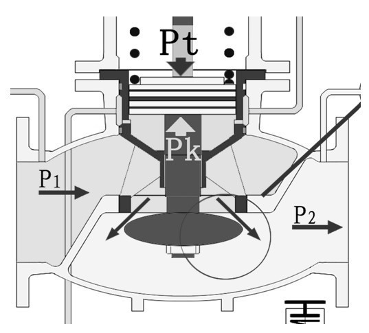 當(dāng)P1上升時(shí),減壓閥的P2+ΔP2首先表現(xiàn)為上升,其值通過(guò)反饋系統(tǒng)出口管傳到控制閥,使Pt′+ΔPt′,ΔPt′與Pk′的力達(dá)到新的平衡,控制閥h減小;相應(yīng)ΔPk′壓力增大,經(jīng)壓力導(dǎo)管,使主閥的Pk+ΔPk,Pt=Pk+ΔPk壓力達(dá)到新的平衡,主閥h減小、ΔP2值恢復(fù)為原P2值。當(dāng)進(jìn)口壓力P1下降時(shí),主閥與控制閥的工況則與上述的工況相反。